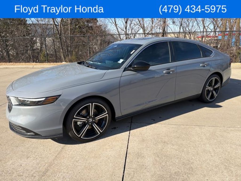 Floyd Traylor is proud to present. Urban Gray Pearl 2025 Honda Accord Hybrid Sport FWD eCVT 2.0L I4 DOHC 16V 2.0L I4 DOHC 16V, 4-Wheel Disc Brakes, 8 Speakers, ABS brakes, Adaptive Cruise Control: Adaptive Cruise Control (ACC) with Low-Speed Follow, Air Conditioning, Alloy wheels, AM/FM radio, Apple CarPlay/Android Auto, Auto High-beam Headlights, Automatic temperature control, Blind Spot Information (BSI) System warning, Brake assist, Bumpers: body-color, Compass, Delay-off headlights, Driver door bin, Driver vanity mirror, Dual front impact airbags, Dual front side impact airbags, Electronic Stability Control, Emergency communication system: HondaLink, Exterior Parking Camera Rear, Fabric Seat Trim, Four wheel independent suspension, Front anti-roll bar, Front Bucket Seats, Front Center Armrest, Front dual zone A/C, Front reading lights, Fully automatic headlights, Heated Front Bucket Seats, Heated front seats, Illuminated entry, Knee airbag, Lane departure: Lane Keeping Assist System (LKAS) active, Leather Shift Knob, Leather steering wheel, Low tire pressure warning, Occupant sensing airbag, Outside temperature display, Overhead airbag, Overhead console, Panic alarm, Passenger door bin, Passenger vanity mirror, Power door mirrors, Power driver seat, Power moonroof, Power steering, Power windows, Radio data system, Radio: 180-Watt Audio System, Rear anti-roll bar, Rear reading lights, Rear seat center armrest, Rear side impact airbag, Rear window defroster, Remote keyless entry, Security system, Speed control, Speed-sensing steering, Speed-Sensitive Wipers, Split folding rear seat, Spoiler, Steering wheel mounted audio controls, Telescoping steering wheel, Tilt steering wheel, Traction control, Trip computer, Variably intermittent wipers, Wheels: 19" x 8.5J Berlina Black.
