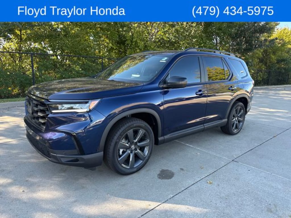 Floyd Traylor is proud to present. Obsidian Blue Pearl 2025 Honda Pilot Sport FWD 10-Speed Automatic 3.5L V6 DOHC 24V 3rd row seats: split-bench, 4-Wheel Disc Brakes, 4.167 Axle Ratio, 7 Speakers, ABS brakes, Adaptive Cruise Control: Adaptive Cruise Control (ACC) with Low-Speed Follow, Air Conditioning, Alloy wheels, Apple CarPlay/Android Auto, Auto High-beam Headlights, Automatic temperature control, Blind Spot Information (BSI) System warning, Brake assist, Bumpers: body-color, Cloth Seat Trim, Delay-off headlights, Driver door bin, Driver vanity mirror, Dual front impact airbags, Dual front side impact airbags, Electronic Stability Control, Emergency communication system: HondaLink Assist, Exterior Parking Camera Rear, Four wheel independent suspension, Front anti-roll bar, Front Bucket Seats, Front Center Armrest, Front dual zone A/C, Front fog lights, Front reading lights, Fully automatic headlights, Heated door mirrors, Heated Front Bucket Seats, Heated front seats, Illuminated entry, Knee airbag, Lane departure: Lane Keeping Assist System (LKAS) active, Low tire pressure warning, Occupant sensing airbag, Outside temperature display, Overhead airbag, Overhead console, Panic alarm, Passenger door bin, Passenger vanity mirror, Power door mirrors, Power driver seat, Power passenger seat, Power steering, Power windows, Radio data system, Radio: 240-Watt Audio System, Rear air conditioning, Rear anti-roll bar, Rear reading lights, Rear seat center armrest, Rear window defroster, Rear window wiper, Reclining 3rd row seat, Remote keyless entry, Security system, Speed control, Speed-sensing steering, Speed-Sensitive Wipers, Split folding rear seat, Spoiler, Steering wheel mounted audio controls, Tachometer, Telescoping steering wheel, Tilt steering wheel, Traction control, Trip computer, Variably intermittent wipers, Wheels: 20" Shark Gray w/Black Lug Nuts.