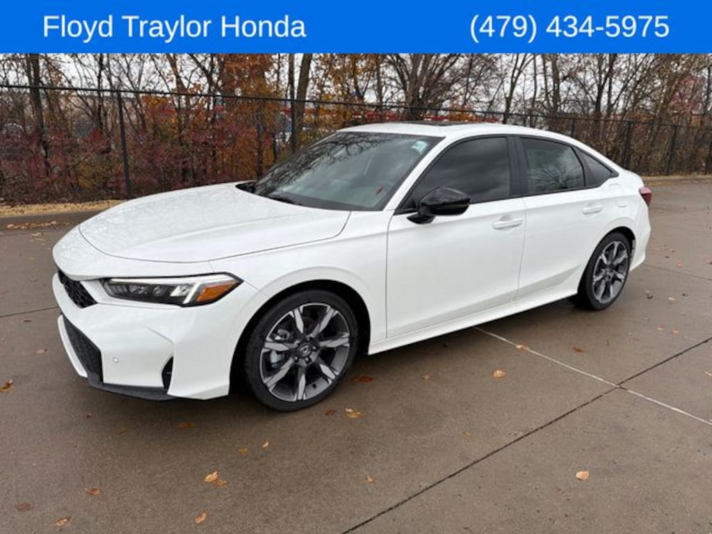 Floyd Traylor is proud to present. Platinum White Pearl 2026 Honda Civic Hybrid Sport Touring FWD eCVT 2.0L 16V DOHC 2.0L 16V DOHC, 12 Speakers, 4-Wheel Disc Brakes, ABS brakes, Adaptive Cruise Control: Adaptive Cruise Control (ACC) with Low-Speed Follow, Air Conditioning, Alloy wheels, AM/FM radio, Apple CarPlay/Android Auto, Auto High-beam Headlights, Auto-dimming Rear-View mirror, Automatic temperature control, Blind Spot Information (BSI) System warning, Bose Premium Sound System, Brake assist, Bumpers: body-color, Compass, Delay-off headlights, Driver door bin, Driver vanity mirror, Dual front impact airbags, Dual front side impact airbags, Electronic Stability Control, Emergency communication system: HondaLink, Exterior Parking Camera Rear, Four wheel independent suspension, Front anti-roll bar, Front Bucket Seats, Front Center Armrest, Front dual zone A/C, Front reading lights, Fully automatic headlights, Heated door mirrors, Heated Front Bucket Seats, Heated front seats, Illuminated entry, Knee airbag, Leather Shift Knob, Leather steering wheel, Leather-Trimmed Seat Trim, Low tire pressure warning, Navigation system: Google Maps, Occupant sensing airbag, Outside temperature display, Overhead airbag, Overhead console, Panic alarm, Passenger door bin, Passenger vanity mirror, Power door mirrors, Power driver seat, Power moonroof, Power passenger seat, Power steering, Power windows, Radio data system, Rain sensing wipers, Rear anti-roll bar, Rear seat center armrest, Rear side impact airbag, Rear window defroster, Remote keyless entry, Security system, Speed control, Speed-sensing steering, Split folding rear seat, Steering wheel mounted audio controls, Tachometer, Telescoping steering wheel, Tilt steering wheel, Traction control, Trip computer, Turn signal indicator mirrors, Variably intermittent wipers, Wheels: 18" Alloy w/Matte Shark Gray Inserts.